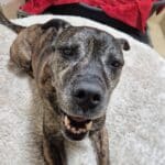 Peitsche ist heute ein etwa 10 Jahre alter Staff-Mix-Rüde, rund 60 cm groß, etwa 34 Kilogramm schwer und selbstverständlich kastriert,